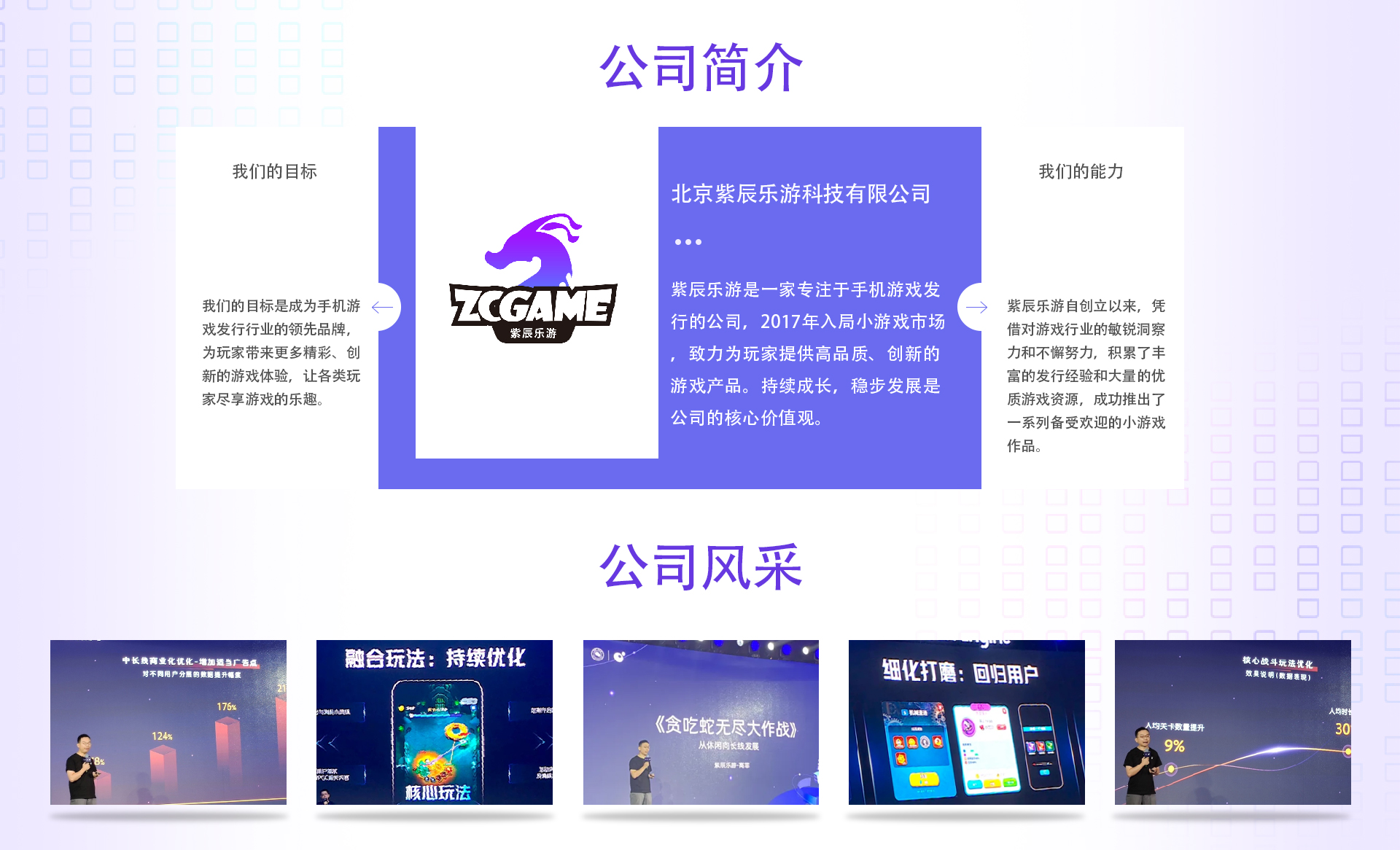 紫辰乐游是一家专注于手机游戏发行的公司,2017年入局小游戏市场,致力为玩家提供高品质、创新的游戏产品。持续成长,稳步发展是公司的核心价值观。